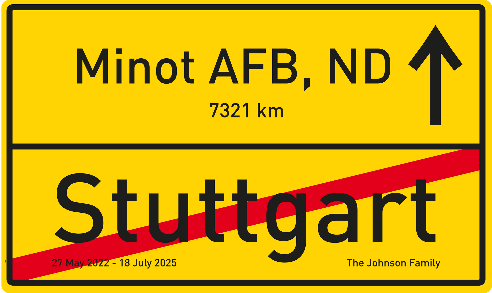 Celebrate your journey with this customized German-style departure and destination sign, inspired by the iconic yellow town signs found throughout Germany. Designed to mark the transition from one meaningful place to the next, it’s perfect for commemorating a PCS move, a new assignment, or the end of a chapter abroad.